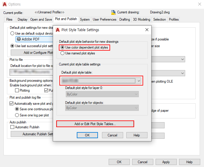 - 플롯 및 게시(Plot and Publish) : 마지막에 성공한 플롯 설정값으로 사용하도록 변경한다. 한 가지로만 출력할 경우에는 편하지만 바꾸어서 작업할 경우가 많은 경우 변경하는 것이 편하다. 또한 플롯 스타일 테이블 설정값에 들어가 자주 사용하는 것을 기본 플롯 스타일(. ctb)로 변경할 수 있다. 플롯 스타일 목록에 없을 경우 그 아래 탭에 들어가 폴더에 사용할 플롯 스타일을 추가하면 된다.