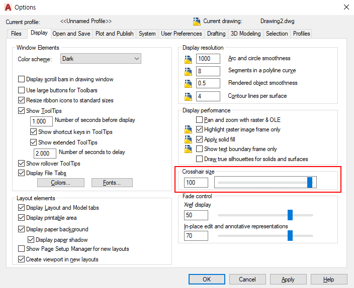 - 제도(Drafting) : 전체적인 설정을 자신의 편의에 맞게 변경한다. 특히 마그넷(Magnet)은 정밀한 작업을 하는데 방해가 되므로 꺼두는 것이 좋다. 그 외 작업의 편의를 위해 변경한 것이 많으니 비교하며 설정하는 것이 좋다. AutoSnap 표식기와 조준창의 크기는 보기 편한 크기로 키우는 것이 좋다. 색상도 잘 보이는 컬러로 바꾸어야 작업이 편하다.