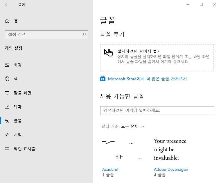 - 'C:\Windows\Fonts' 경로 또는 '제어판>모양 및 개인 설정>글꼴'로 이동하면 현재 윈도우 글꼴을 볼 수 있다.